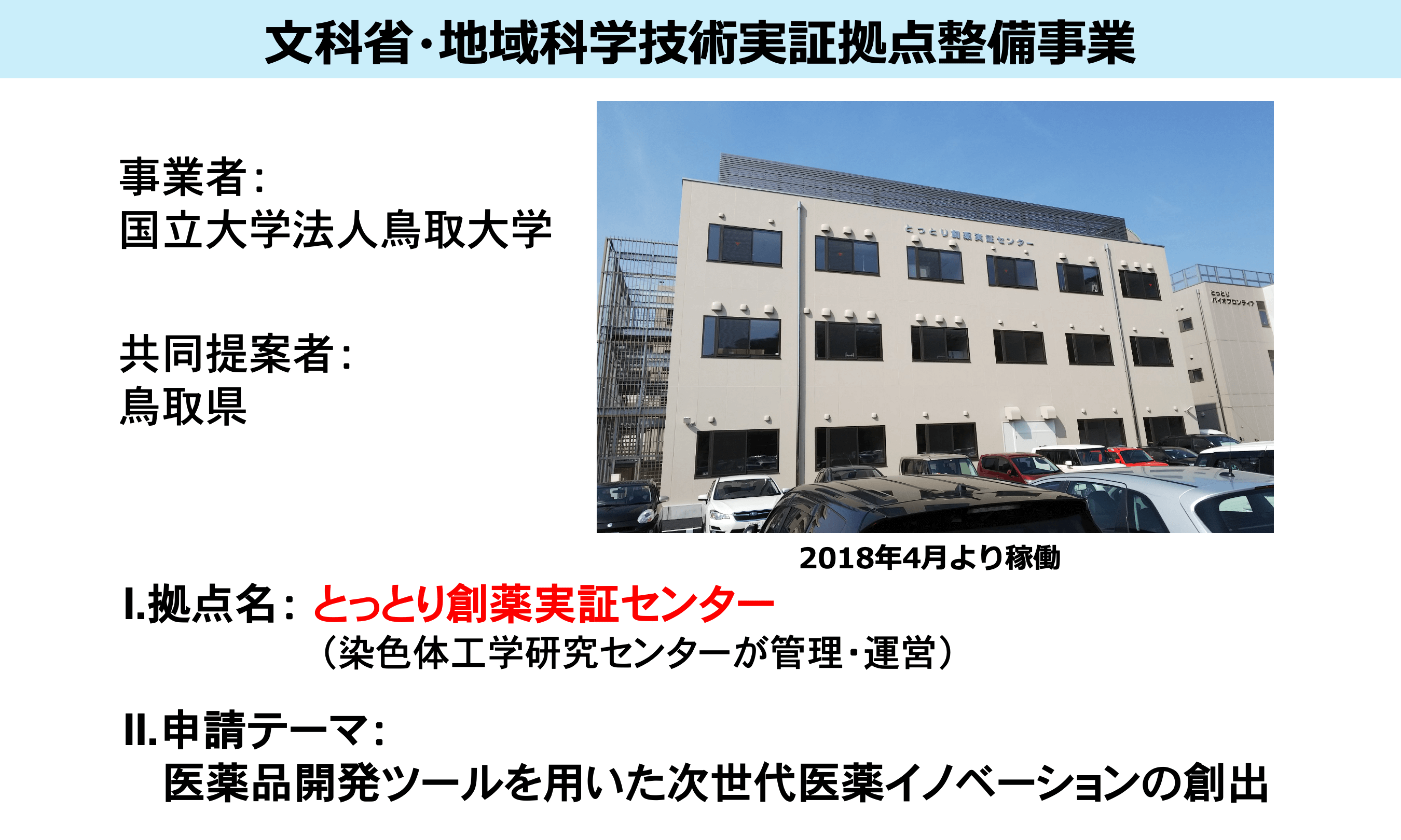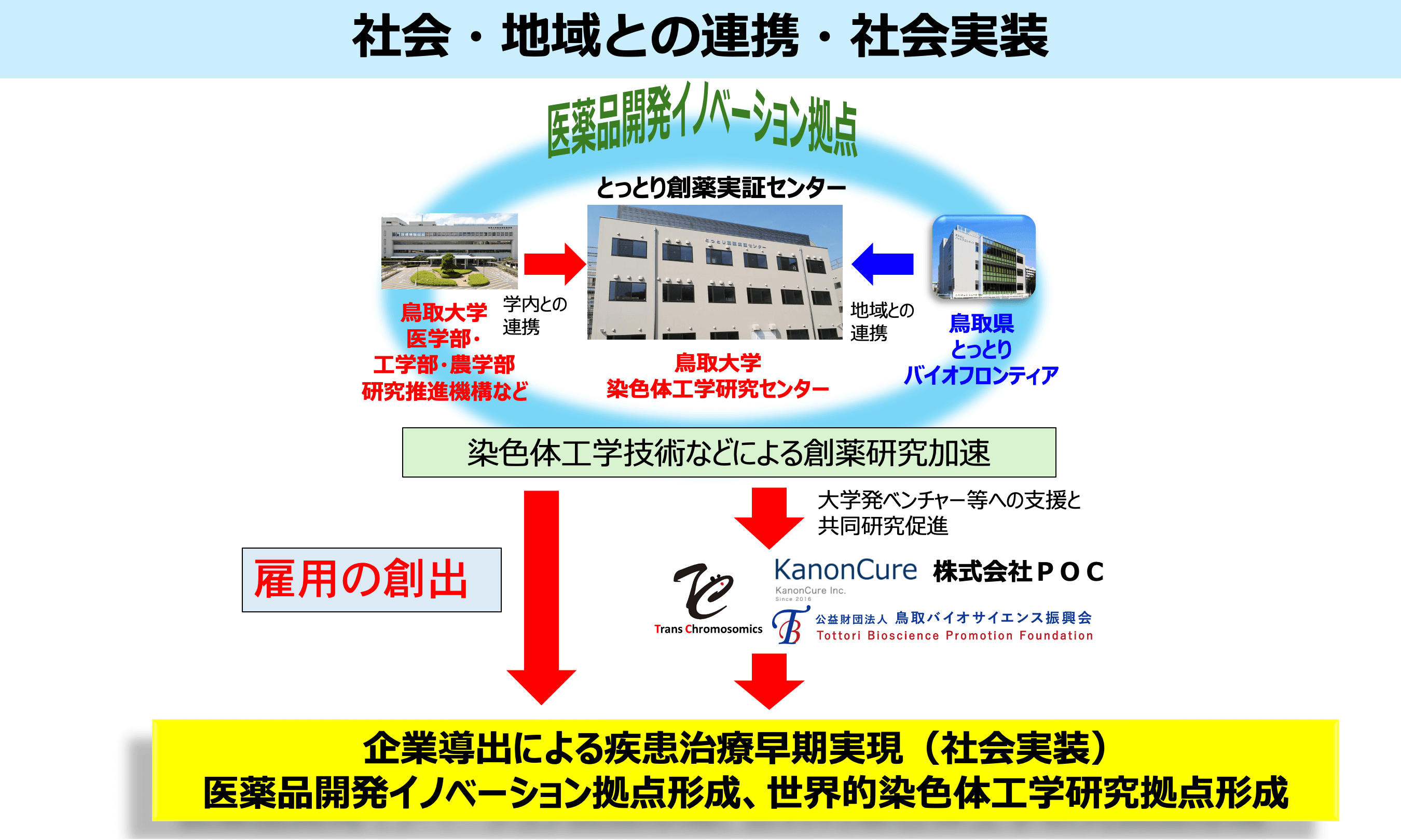 鳥取県と鳥取大学においては、これまでの連携協力を踏まえて、平成22年鳥取県経済成長戦略及び平成25年鳥取県経済再生成長戦略に基づき、医療イノベーション(創薬)分野において、染色体工学技術などを技術シーズとして、上述の産学官連携による「とっとりバイオフロンティア」を鳥取県が支援し、連携協力により研究開発力の集積、シーズを活用する企業等との連携ネットワークの形成等を図ってきました。今後も、鳥取県「令和の改新」県民会議と鳥取大学「地域未来共創センター」が取り組む地域課題解決ワーキンググループと連携しながら、特に医療・ヘルスケア分野での役割の一部を本拠点が担っていきます。