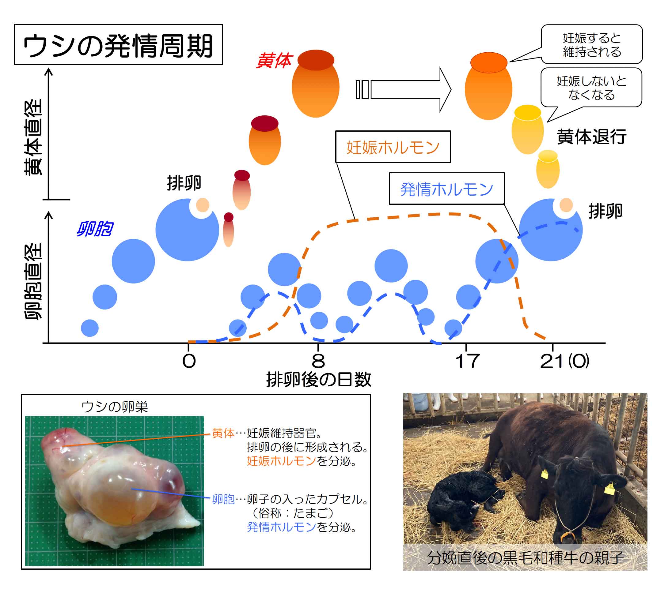 我々獣医繁殖学研究室では、いわゆる畜産、中でもウシの繁殖に特化した研究を進めいています。ウシはヒトと同様に単胎(胎子が単一)の動物で、生産効率が高くありません。しかし、人間社会において古くは役用、また現在に至るまで食品として高い需要があり、長い歴史の中で人為的に選抜育種されてきました。その結果、乳生産あるいは食肉生産に特化した種や両利きの種(兼用種)が生み出され、現在世界各地で様々な品種のウシが我々人類の食を支えています。このような背景を持つウシについて、当研究室では、雌で周期的に営まれる発情周期(図1;ヒトにおける排卵周期と同義)がどのように調節されるかを卵巣機能、中でも黄体(図2)という臓器に着目して展開しています。黄体はウシにおいて妊娠を成立、維持させるために必須のプロジェステロンというホルモンを分泌する臓器であり、排卵後、卵子を包んでいた卵胞という組織が機能を変化させて形成されます。分娩により妊娠が終わる時、あるいは妊娠が成立しなかった際には黄体はその役割を終え卵巣から消失します。この一連の動きがどのように調節されるかを調べることで妊娠に至る過程とその中のコアなポイントが明らかとなり、より確実に妊娠を成立させるアプローチの基礎になると考えています。鳥取県でウシと言えば、なんといっても黒毛和種牛で、ブランド名「鳥取和牛」として全国的に知られています(図3)。我々の研究室では、鳥取県産の黒毛和種牛の改良を担う鳥取県畜産試験場と協力して、胚(受精卵が発育したもの)の品質評価や精液の性状評価の新技術開発にも取り組んでいます。染色体工学は生物の中の細胞の中で様々な遺伝子を載せた長い分子 DNA の配列(ゲノム)の並びを人為的に操作する技術です。これを上記のような卵巣の生理学、あるいは鳥取和牛の生産に向けた研究に活用することが我々の立場です。