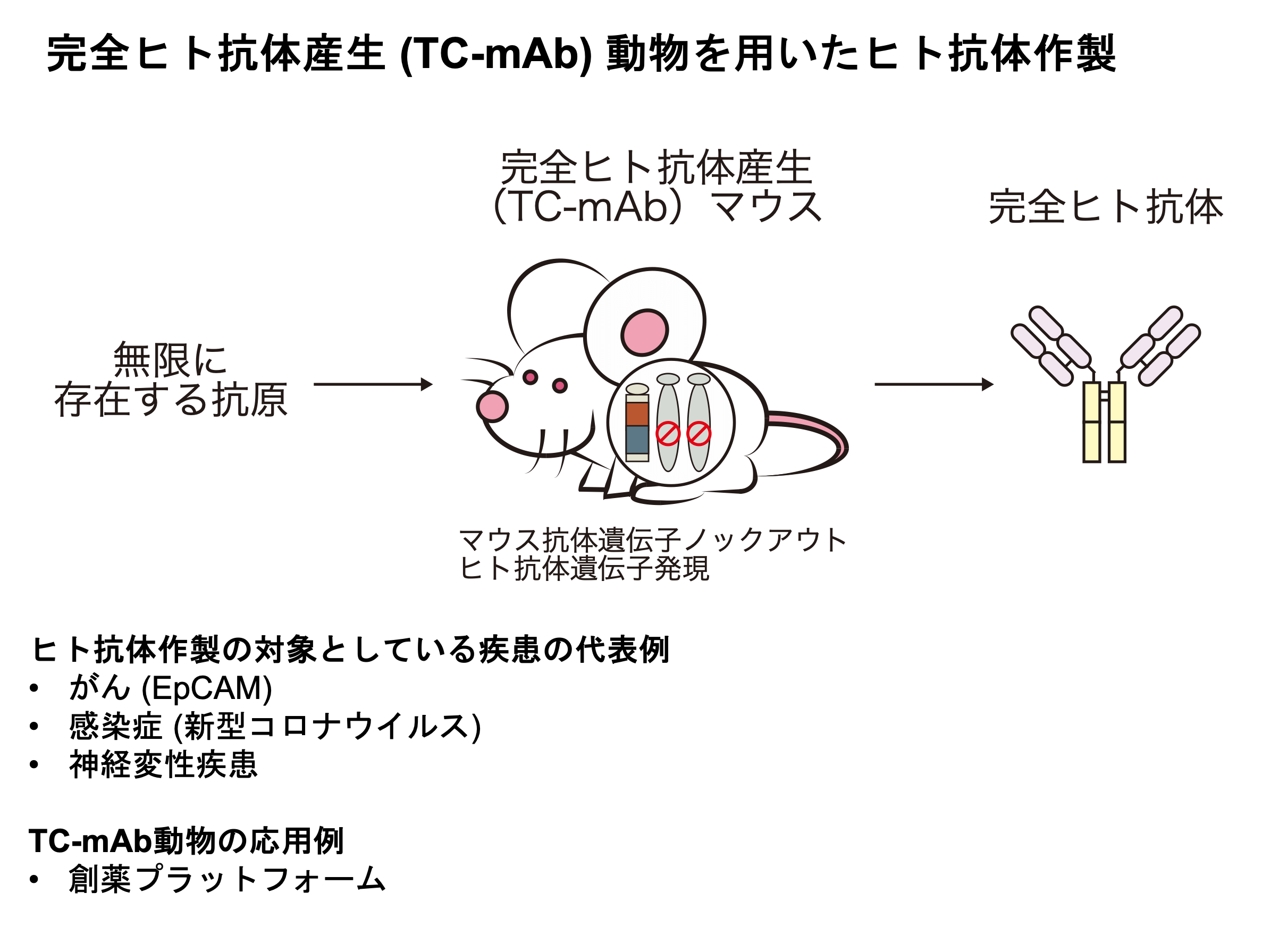 そこでTC-mAbマウスやその他の要素を組み合わせた創薬プラットフォームの構築に取り組んでいます。