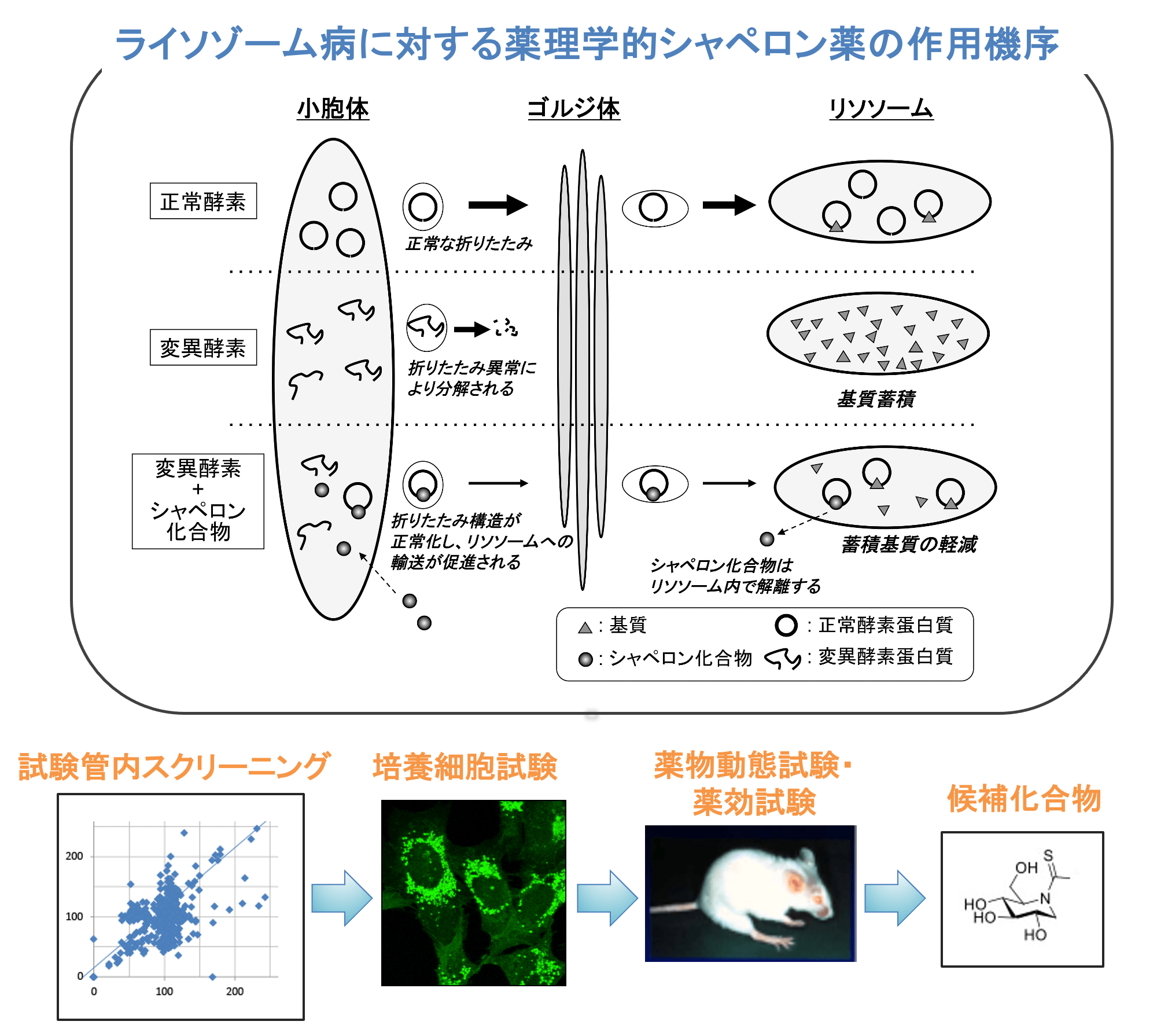 この療法では、患者細胞内で欠損しているライソゾーム酵素に親和性をもつ薬理学的シャペロン化合物を用い、