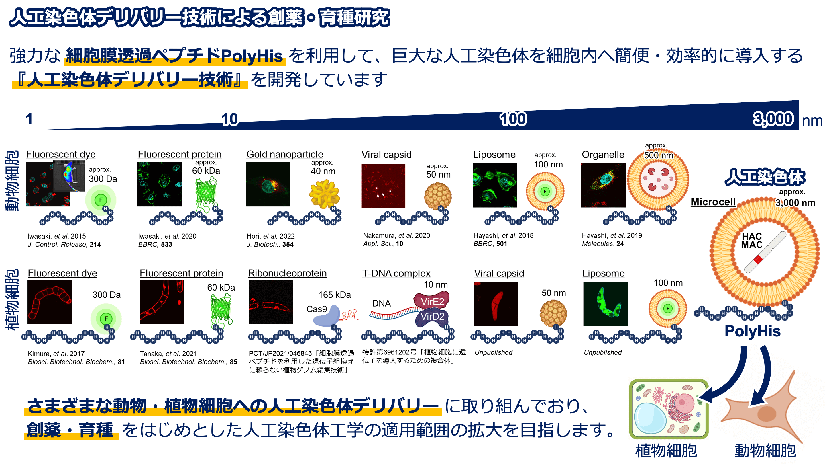 これまでに、PolyHisを利用して、さまざまな大きさの物質(数nmサイズの化合物から、数百nmサイズの膜小胞まで)を動物・植物細胞内へ輸送できることを実証し、
