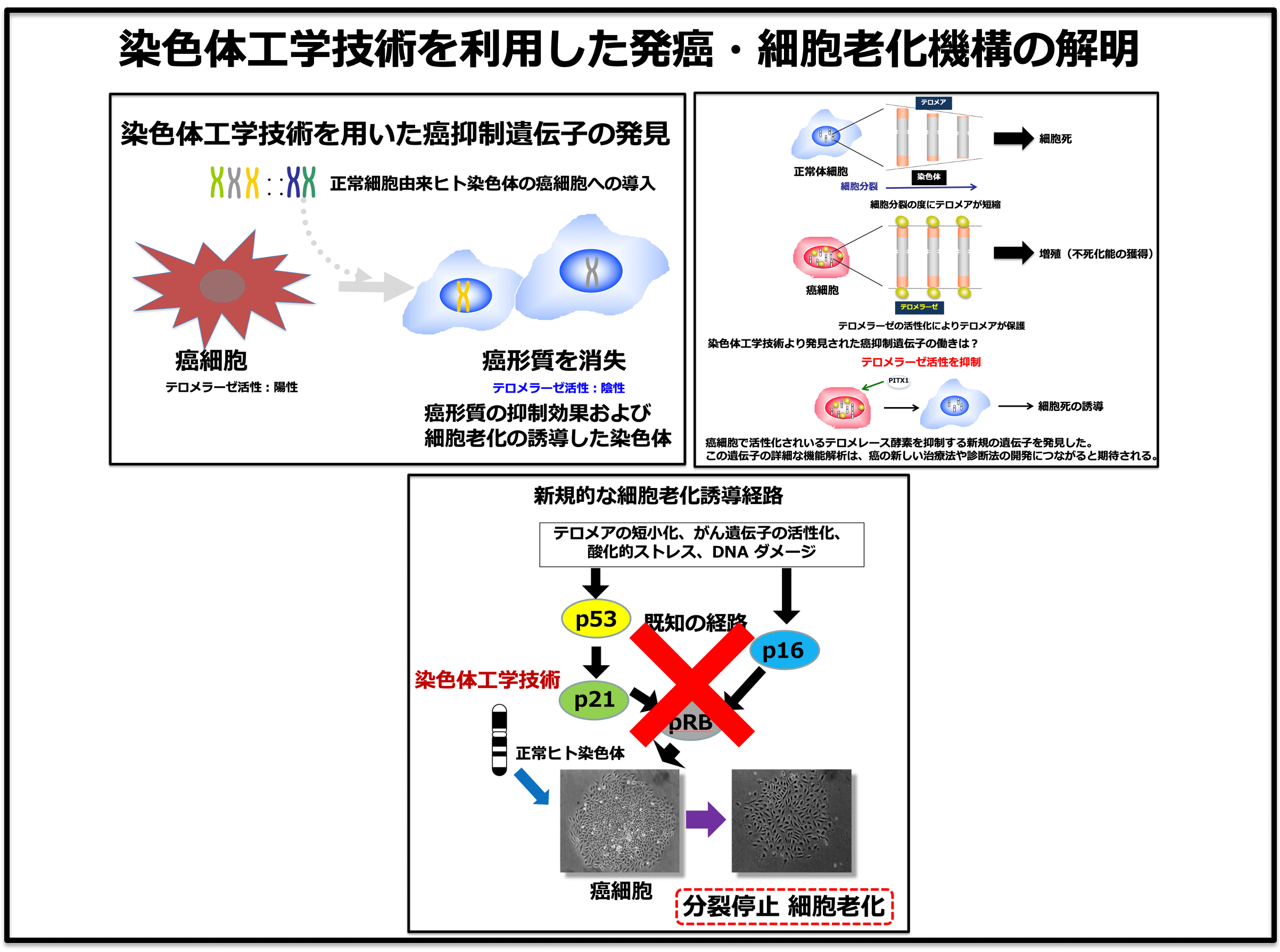 一方、テロメラーゼの制御や細胞老化の誘導に重要な働きを担っているp53やp16に依存しない未知の老化誘導機構の存在が染色体工学研究より明らかにされており、