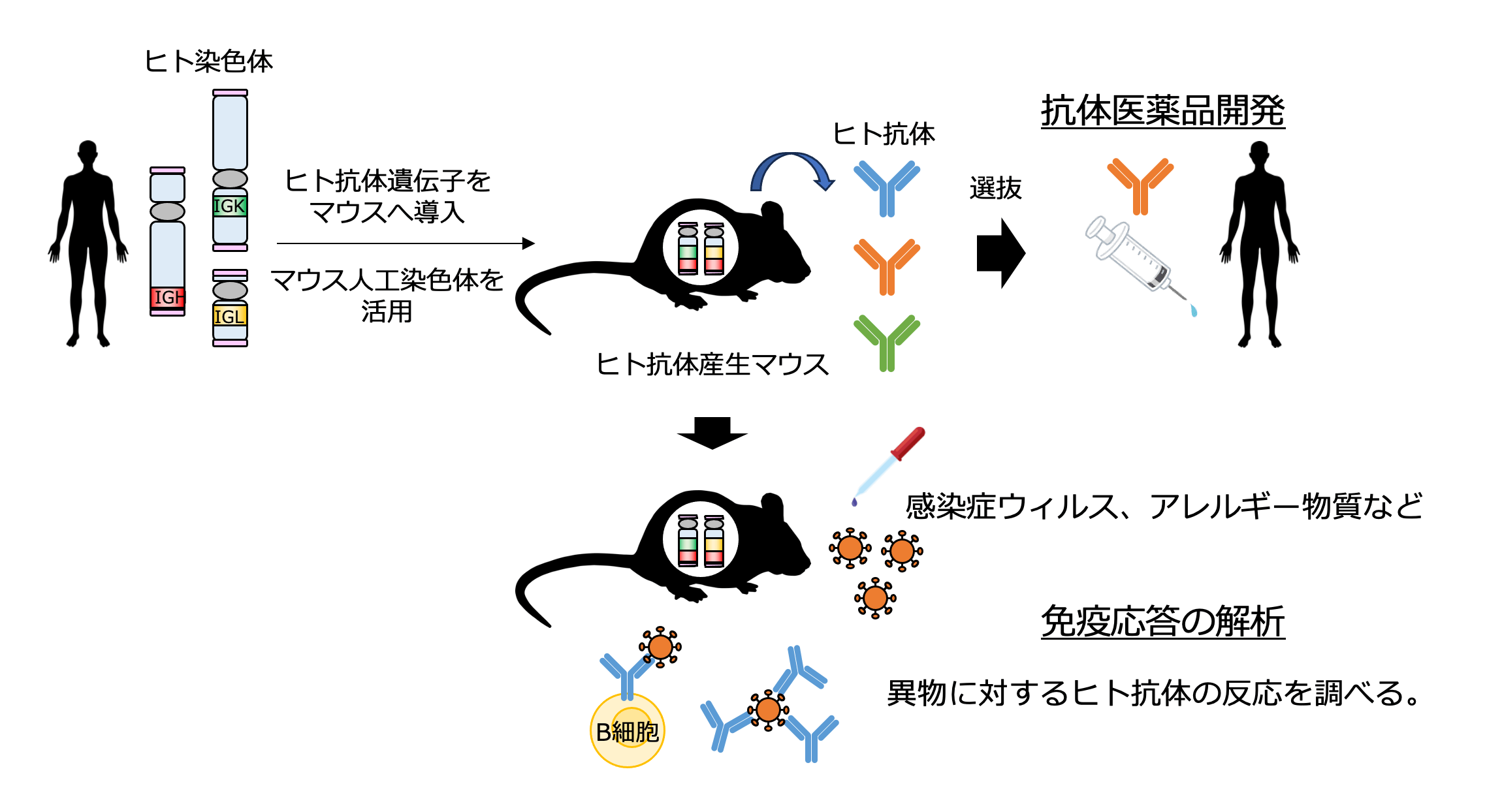 これらのマウスモデルを利用して、ヒトの抗体による免疫応答の解析やヒトの生体内では取得しづらい稀少抗体の探索を検討しています。