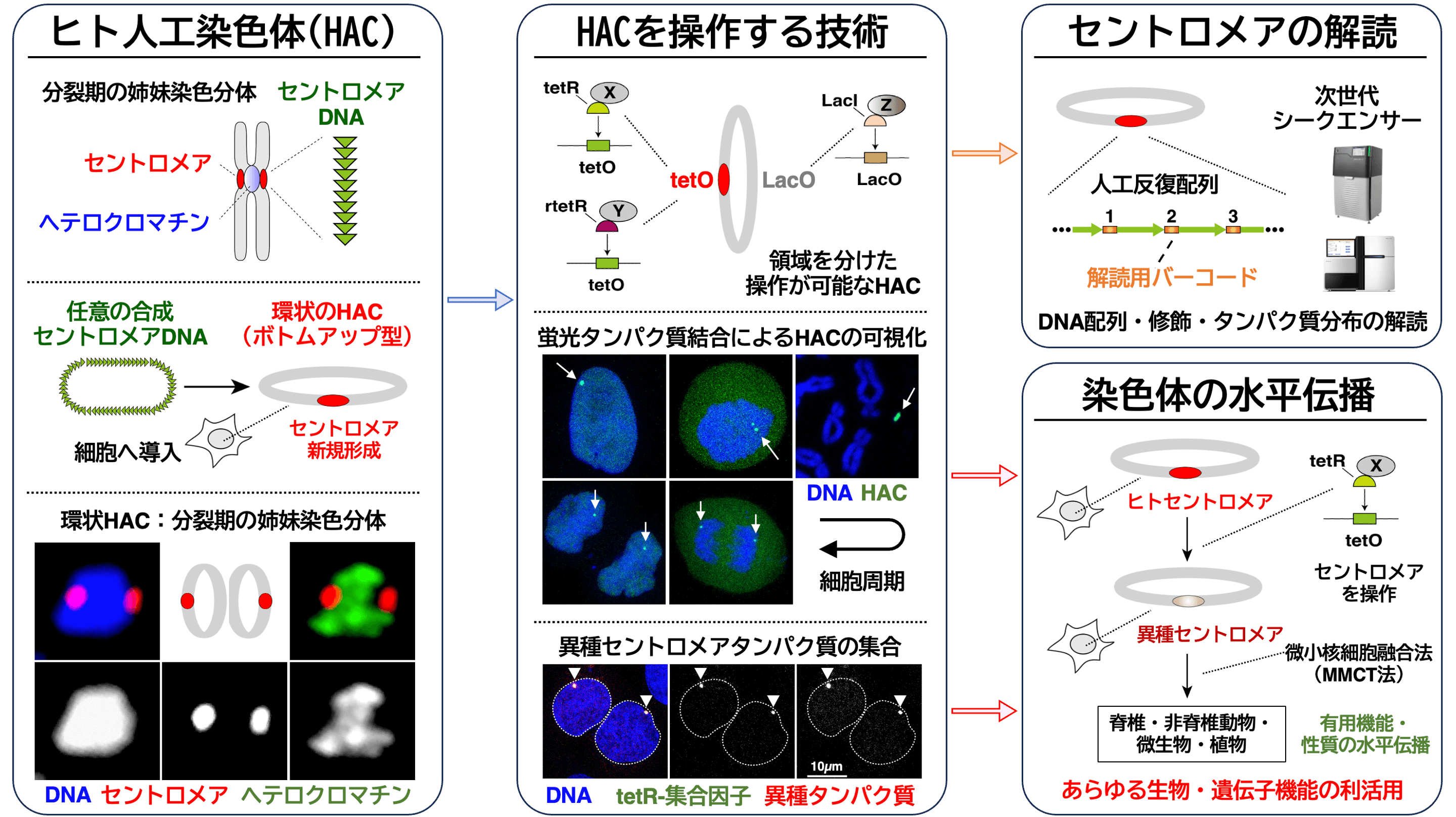 私たちは、このセントロメアをより深く理解し操作するために、セントロメアとそれ以外の領域を別々に操作・解読できるヒト人工染色体を開発しました。