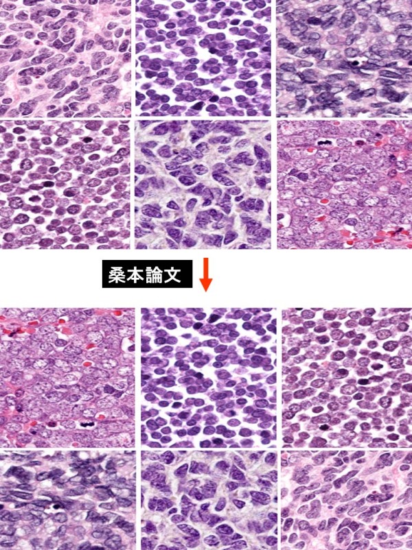 直感的に上段と下段の症例の細胞像の違いに気づきますが、この見た目を数値化して客観性を持たせて検討しました。