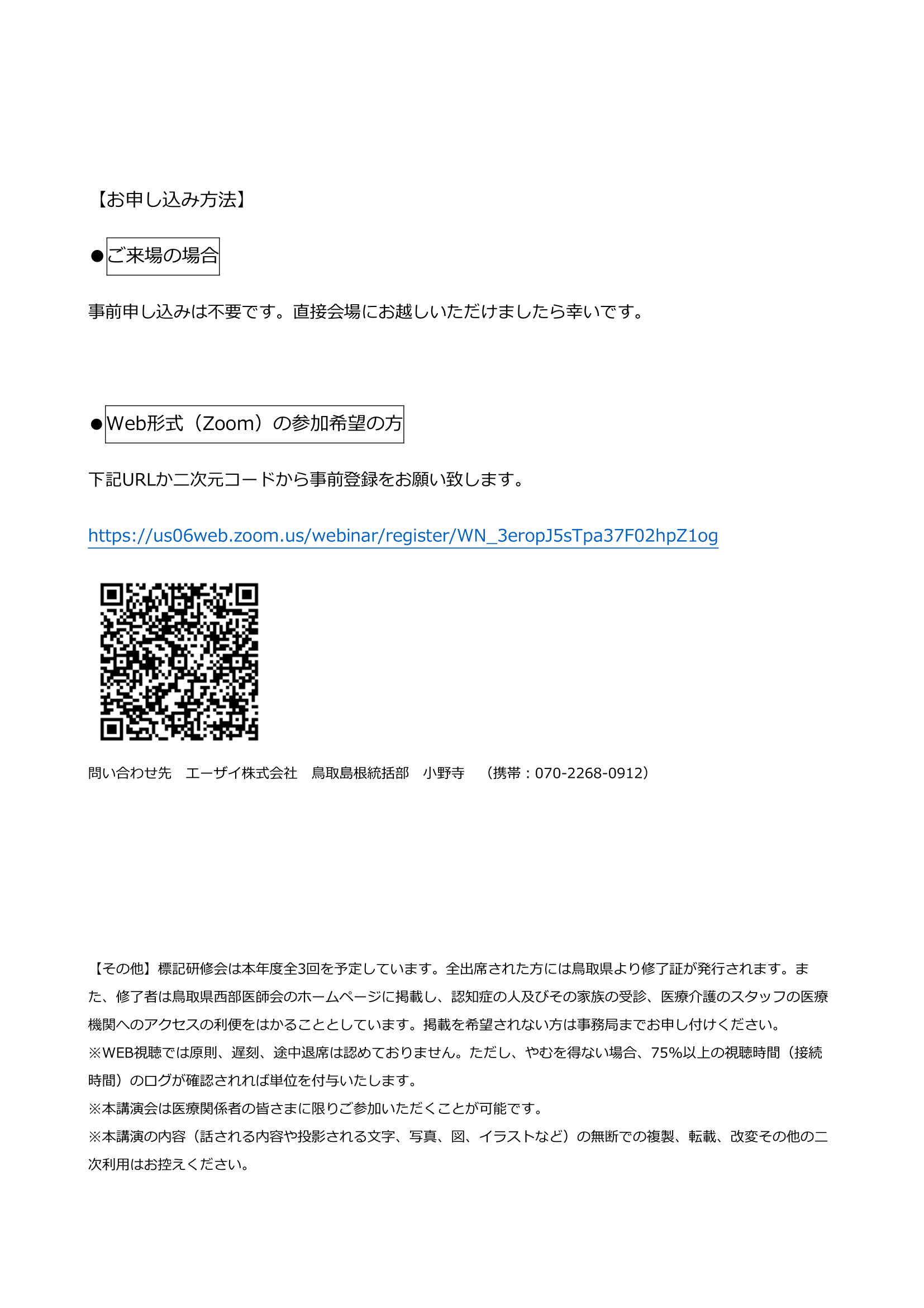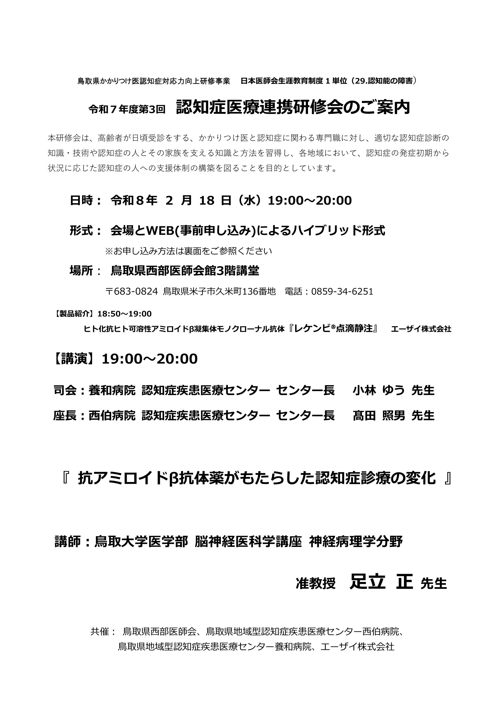 共催:鳥取県西部医師会、鳥取県地域型認知症疾患医療センター西伯病院、鳥取県地域型認知症疾患医療センター養和病院、エーザイ株式会社