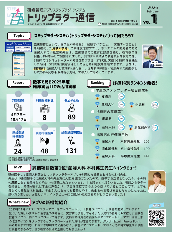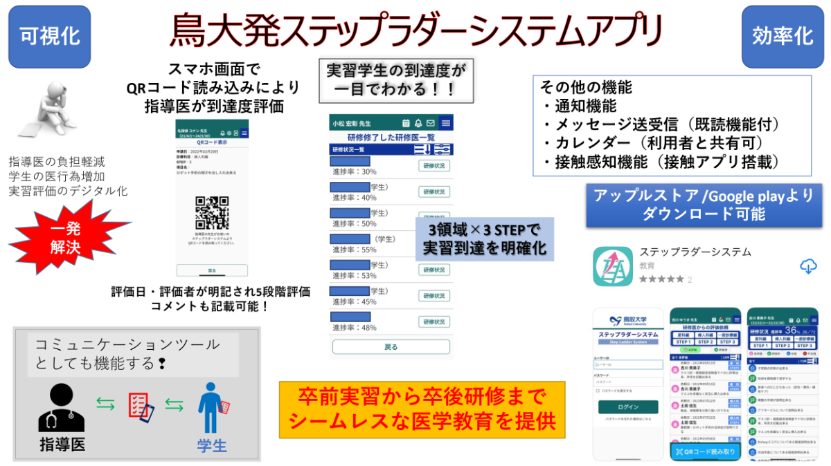 当教室では、臨床研修医教育の質を最大化するため、独自に開発したステップラダーシステムアプリを活用した新しい臨床教育を実践しています。