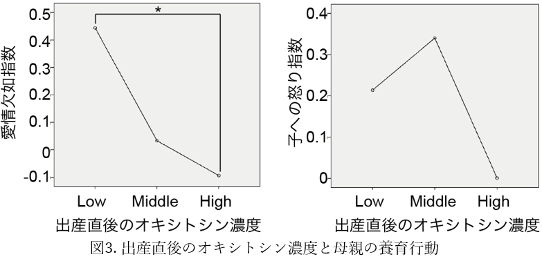 さらに、他の要因を調整しても、出産時のオキシトシンが高いと育児を楽しまなくなるリスクが低下することがわかりました。そしてその影響がどこまで続くのか調べるために、出産一年後の質問表から子どもへの愛情欠如指数と子どもに対する怒り指数を計算しました。オキシトシン濃度を低・中・高に分けて平均指数を計算したところ、オキシトシン濃度が高いほど子どもへの愛情欠如指数が低下する(=愛情が多くなる)ことがわかりました(図3)。
